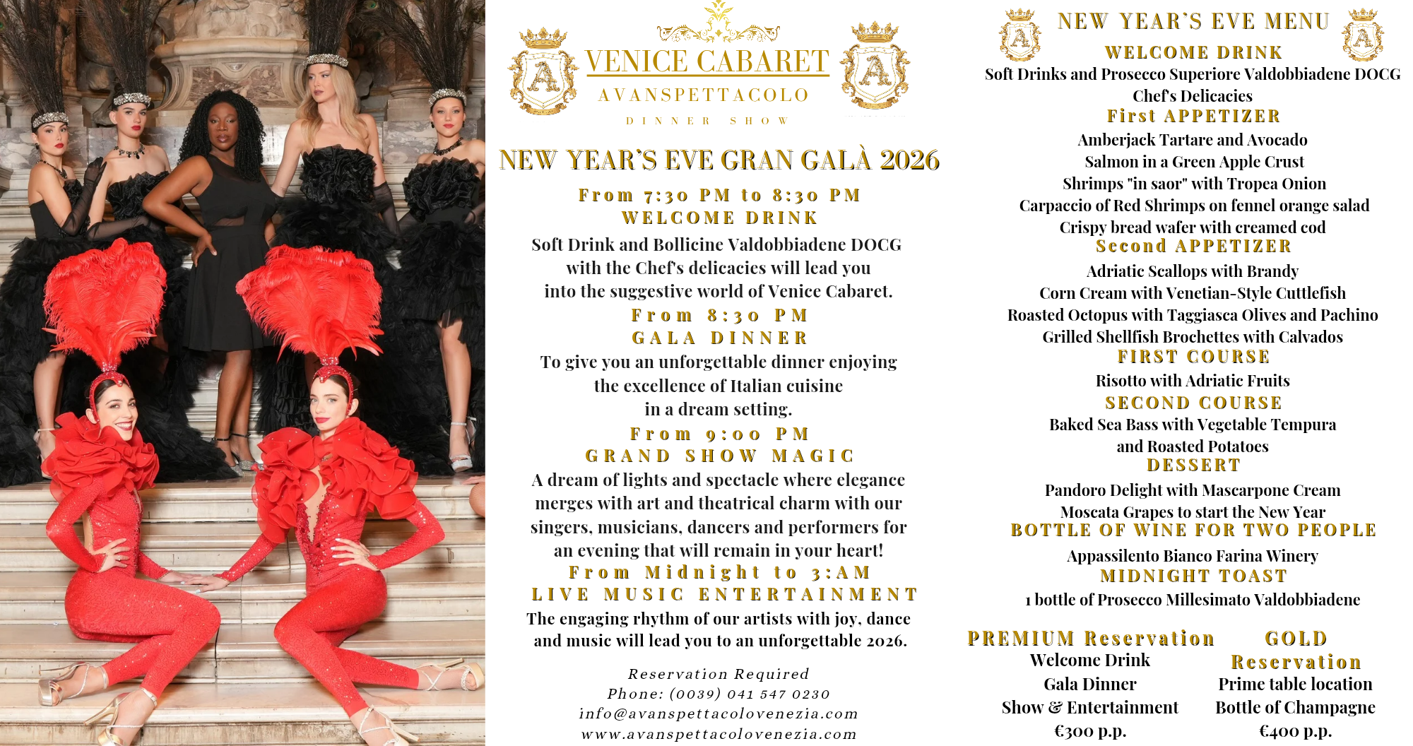 From 20:30 onwards Gala dinner and Grand Show Magic show in the Theater Hall. For the Gala dinner, the chef of Avanspettacolo Venezia offers a refined seafood menu including: starters, first course, second course, dessert, water, bottle of wine for every two people and a bottle of sparkling wine for each table for the midnight toast. Attached we send our program and menu proposal. Alternatively, a vegetarian or meat based menu is available upon request.